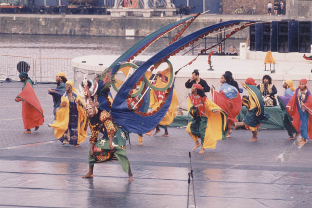 Photograph of the performance showing the Al- Buraq costume realised from the artwork for the wing costume.