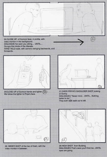 Storyboard for the 37 film scenes, pencil sketches. Panel of film scenes 24-28.