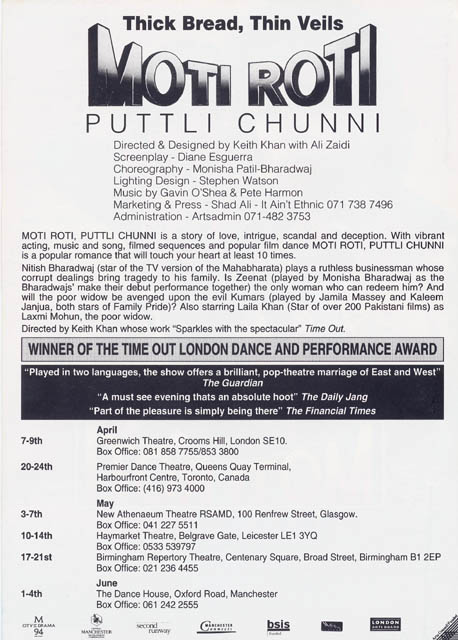 Both sides of flyer for the touring production, 7th April-4th June, 1994.