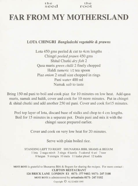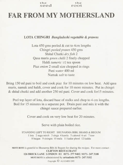 Front of recipe card with Shunarma Bibi, Shams and Begum. The Clifton Restaurant in Brick Lane, London was the setting of “Far From My Mother’s Land”. The back features the recipe for Lota Chingri.