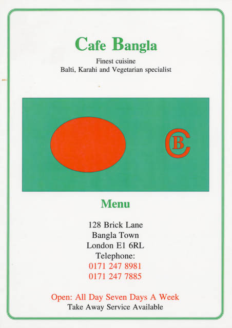 Menu card from Café Bangla in Brick Lane, using an image form "The Seed The Root".