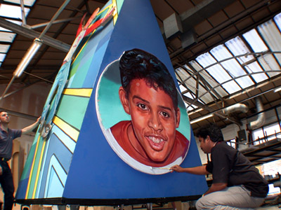 Bangalore artist painting the Rainbow Children float used in the Parade.