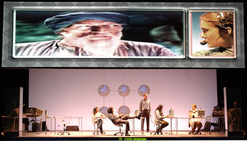 Act 2: Banagalore. Scene at the call centre with wide-screen video projection above, mixing live and recorded elements.